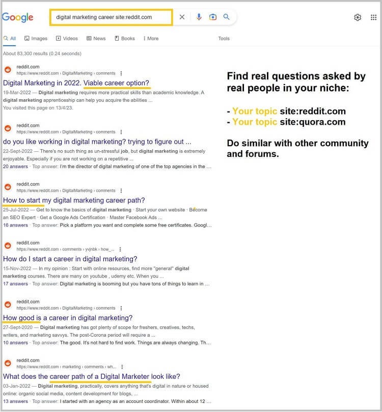 - Second, Google [your topic site:(domain of the community site)]