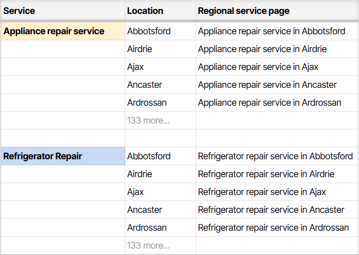 Imagine the number of possible pages appliancerepairexpert.ca can create with the above content matrix.