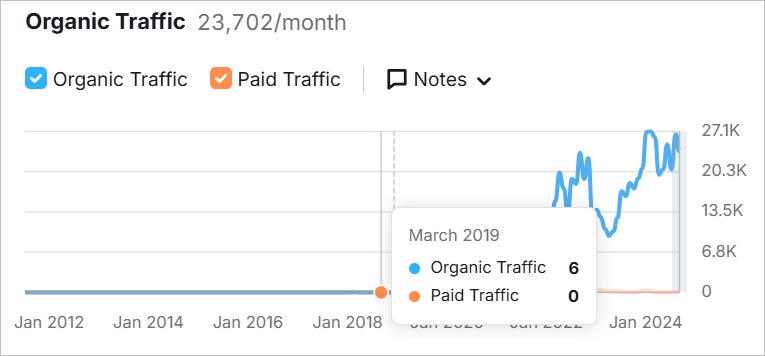 The site started investing in SEO around 2019, as per Semrush’s historical traffic data: